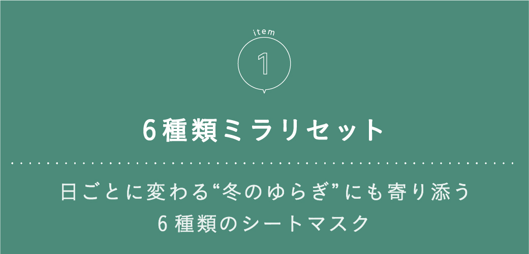 ミラリのシグネチャー商品である、たっぷりとうるおいを届けてくれる6種類のフェイシャルトリートメントマスク。それぞれ異なる美容液やシート、香りなどを楽しみながら、その日の肌や気分に合わせて選べるセットです。