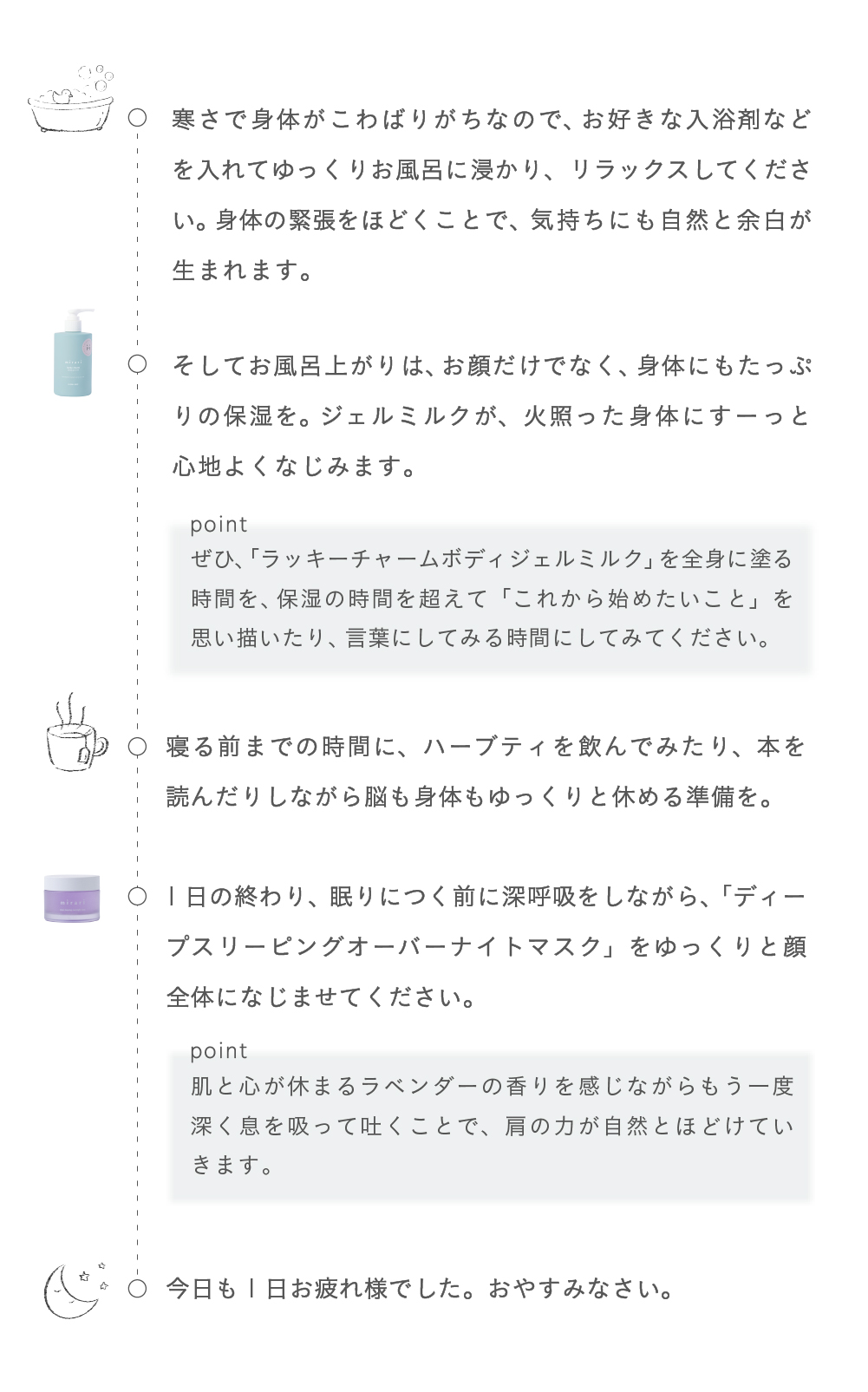 自分の手でそっと包み込むように、ジェルミルクでほぐしながら保湿し潤いを。