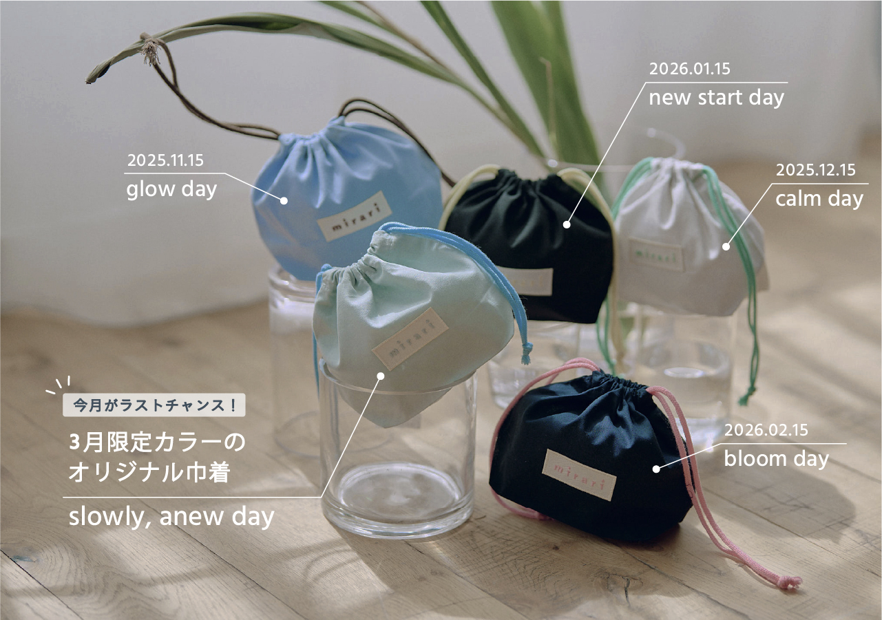 限定100名さまに贈る巾着付きスペシャルセットとして、毎月の巾着をミラリ代表 カン・ハンナさんがテーマに合わせて巾着の形やカラー、刺繍の形、紐の色と一つひとつこだわりながら、組み合わせを考え作ってまいりました。
